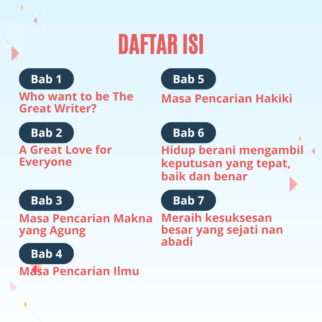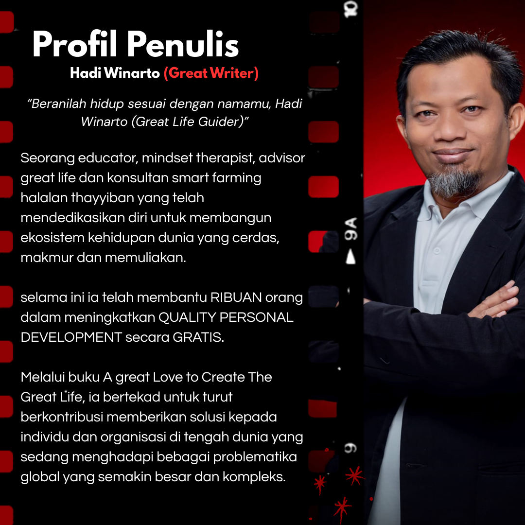A Great Love to Create The Great Life mengajak pembaca untuk menyadari bahwa impian besar tidak akan berarti tanpa cinta yang agung. Penulis menggambarkan bahwa kesuksesan, kekayaan, dan popularitas hanyalah fatamorgana bila tidak disertai ketenangan dan makna hidup sejati. Melalui refleksi dan pengalaman hidup orang-orang pilihan, buku ini menuntun kita untuk memahami proyek terbesar dalam hidup manusia — yaitu membangun kehidupan yang mulia melalui cinta yang besar dan abadi. Dengan pendekatan reflektif dan aplikatif, buku ini membantu pembaca menemukan makna cinta sejati yang menjadi fondasi bagi kehidupan yang cerdas, harmonis, makmur, dan penuh manfaat bagi diri, keluarga, masyarakat, serta dunia.